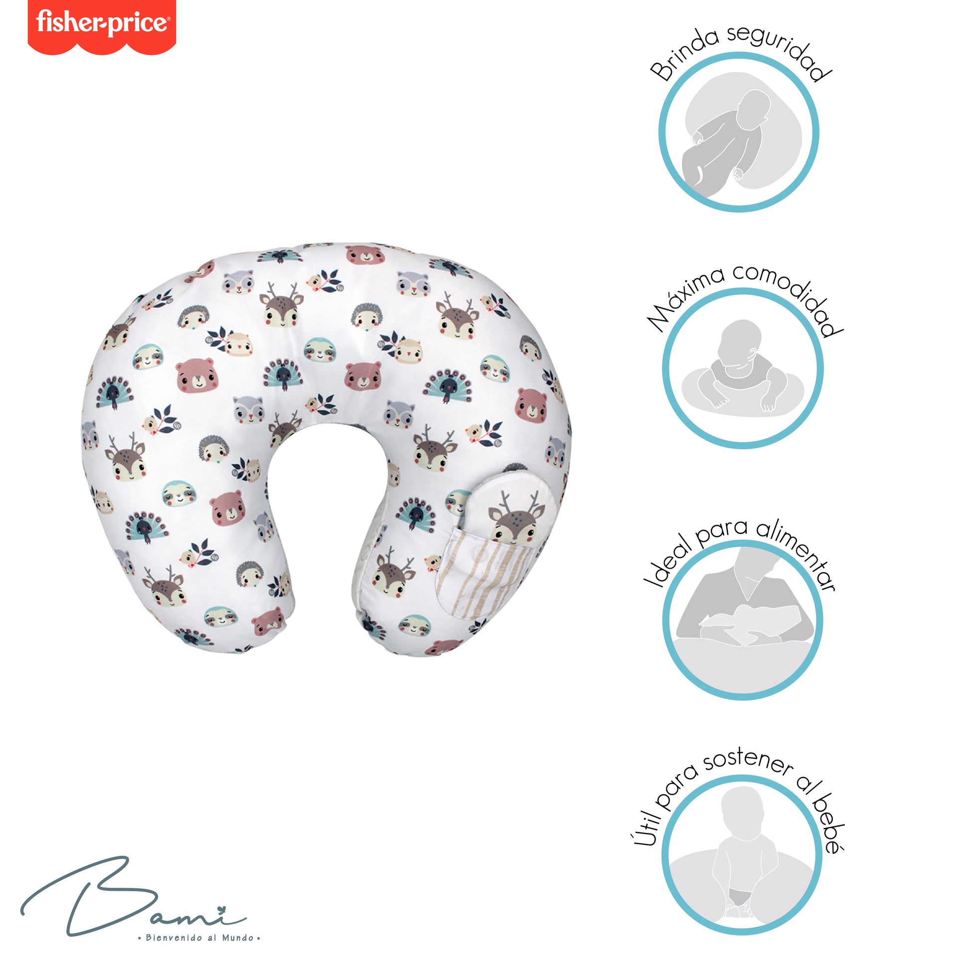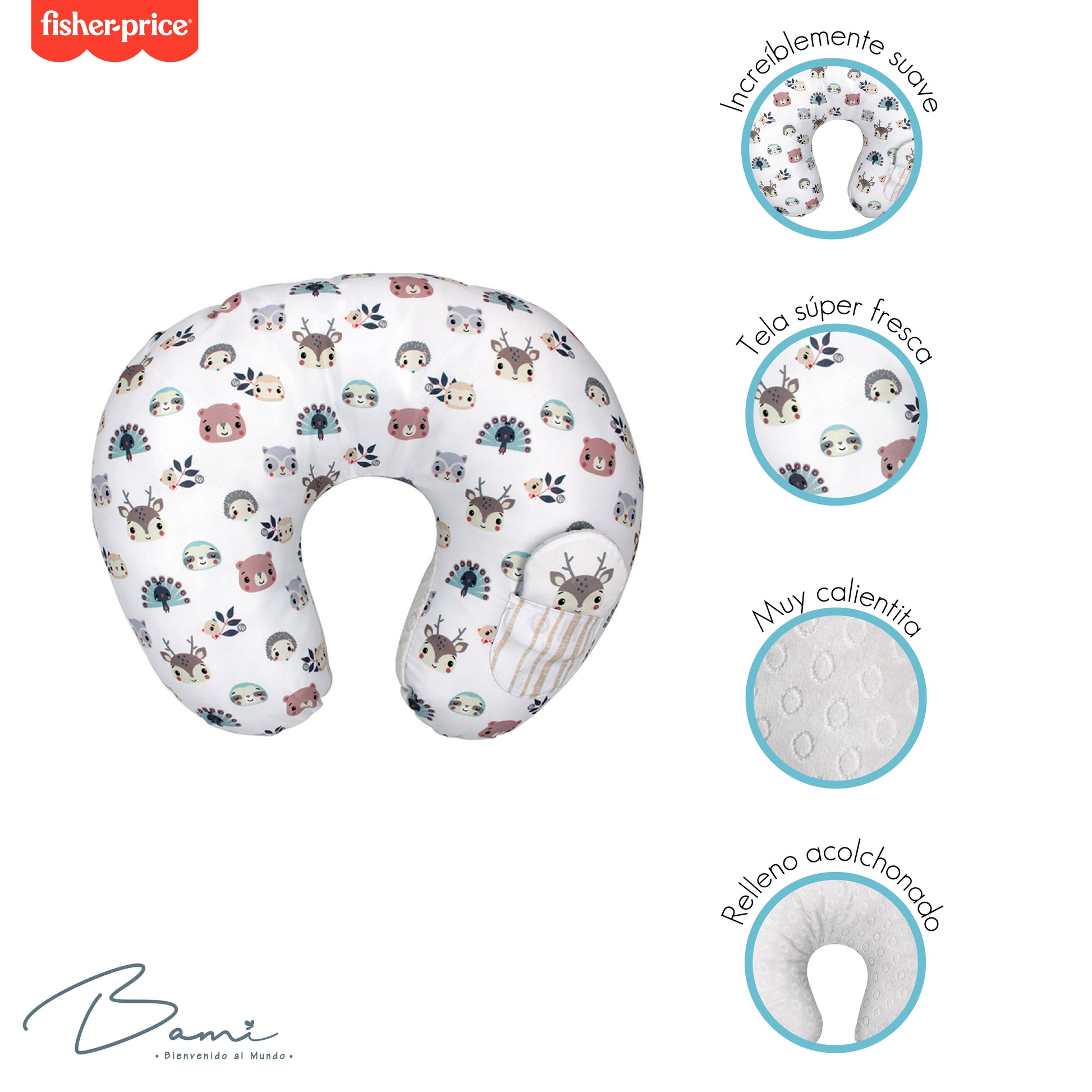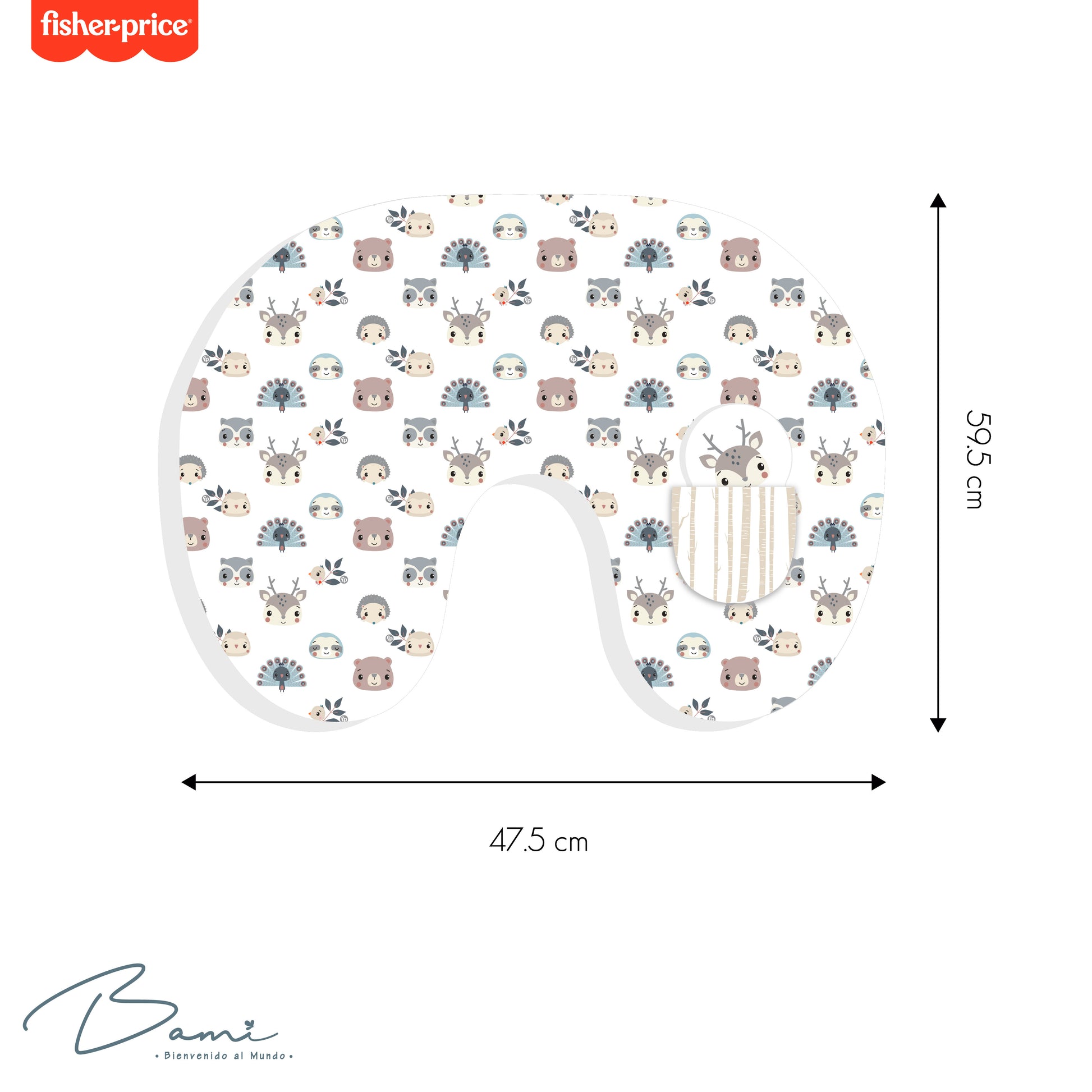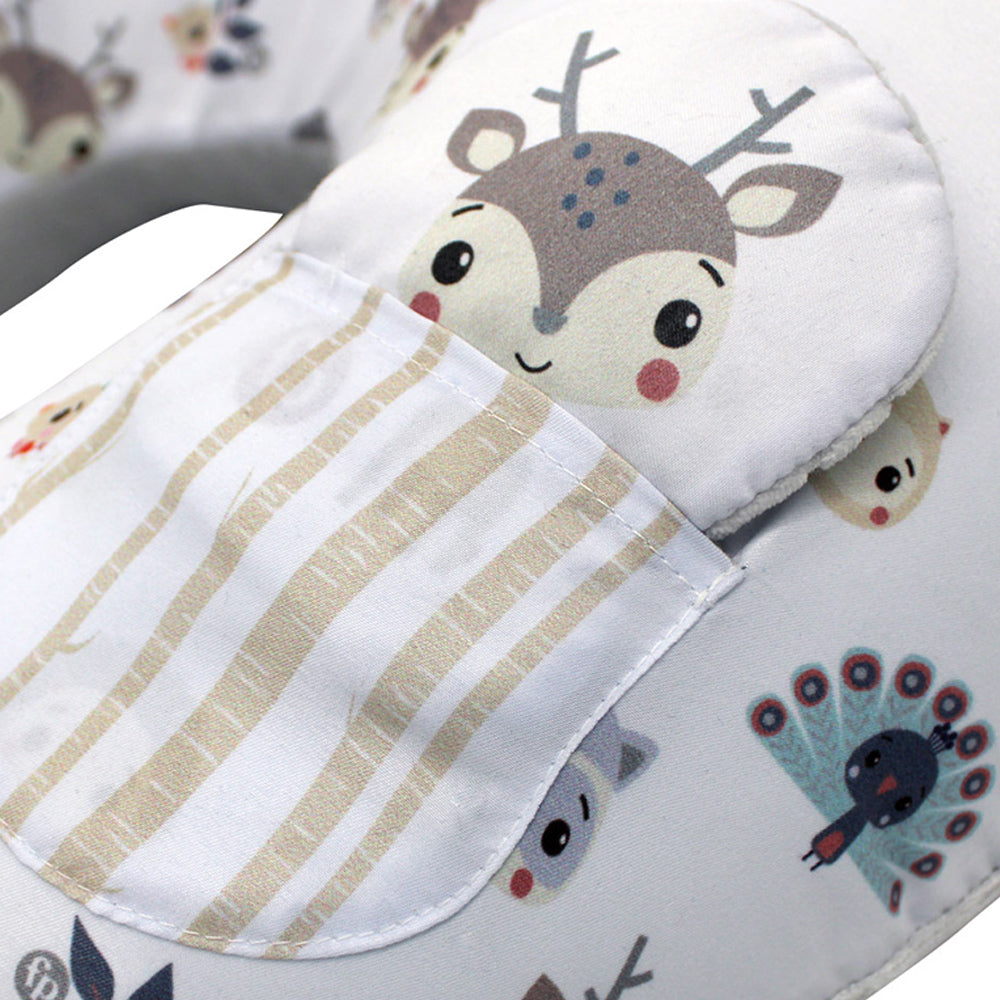 Cojín de lactancia con funda de lado afelpado calientito y del otro lado fresco impreso con diseño de animales del bosque que permite a la madre una posición cómoda y segura al momento de alimentar al bebé; ya sea con pecho o botella.